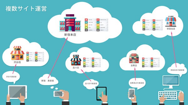 複数の店舗を運営する美容室のホームページは「単独サイト運営」と「複数サイト運営」の2つの方法があります。「単独サイト運営」はひとつのホームページ内で全店舗のページを掲載する方法です。「複数サイト運営」は各店舗ごとに独立したホームページを用意して、それぞれのサイトを連携して運営する方法です。それぞれのメリット・デメリットを考慮してのサロン様にあった運営方法をお選び下さい。